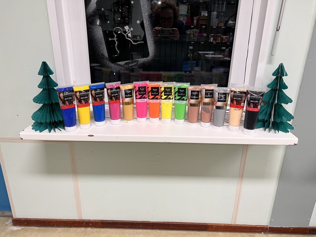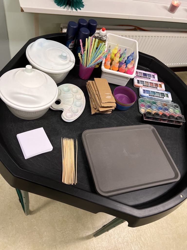 ✨ Gezellige tafel vol stiften, potloden, verf, en creatieve materialen